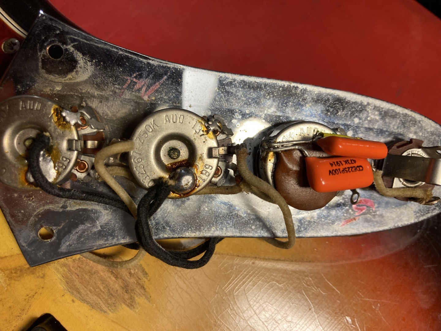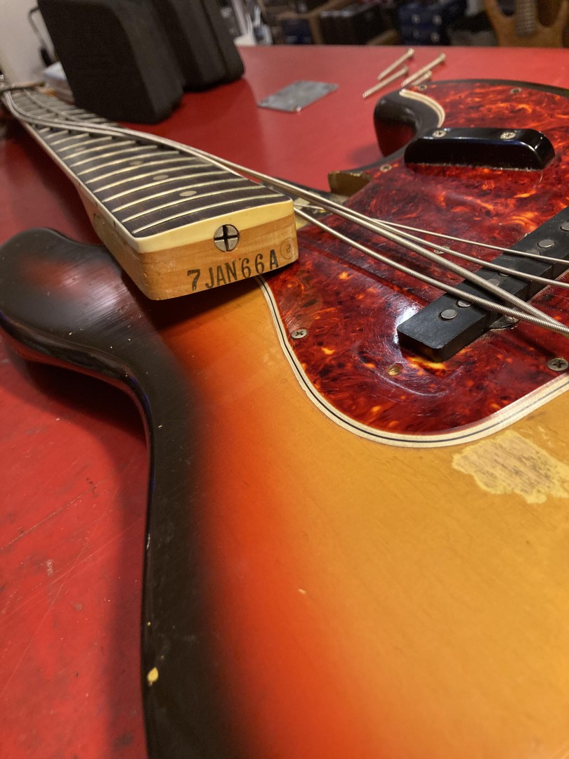 Veel beter dan deze komen ze niet lieve mensen. In de eerste paar maanden van 1966 besloot Fender de meest verzamelbare Jazzbas van allemaal te maken: met dots en bindings en de ovale tuners, de lepeltjes. Fraaier dan dit wordt 't niet. En deze bas is er dan uiteraard ook nog eens eentje van de categorie "oh, hij klinkt ook nog eens gruwelijk goed..." zoals te verwachten was. Het originele brugpickup zit er weer opnieuw in en op de toonpot zitten twee extra condensatoren waardoor die een groter bereik heeft gekregen. Super vet! Originele koffer zit erbij.
